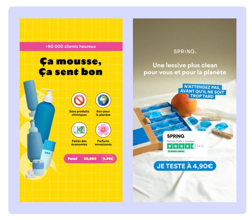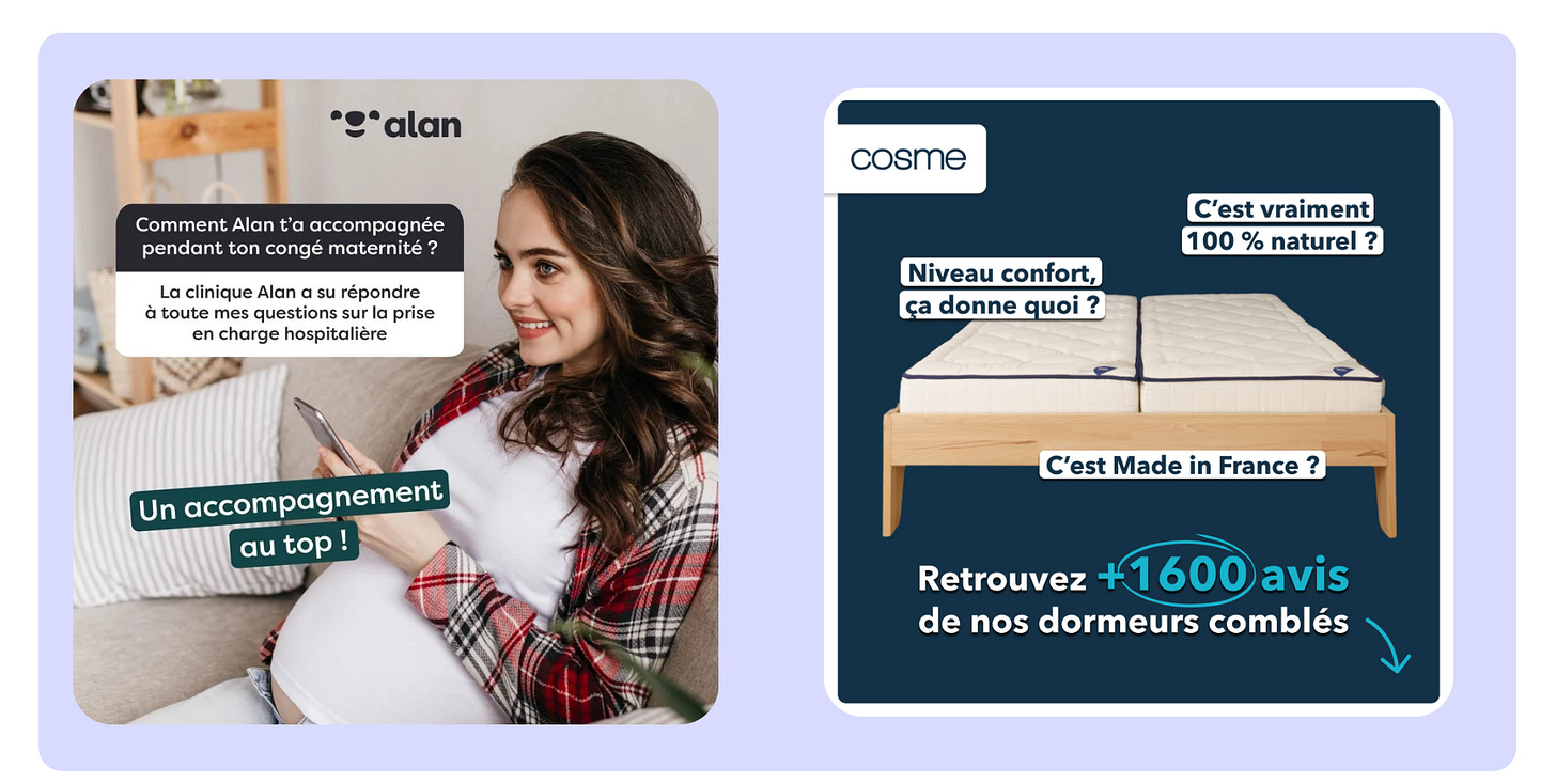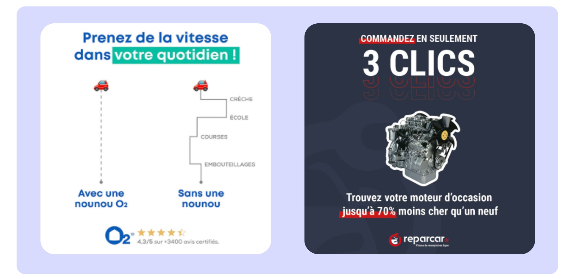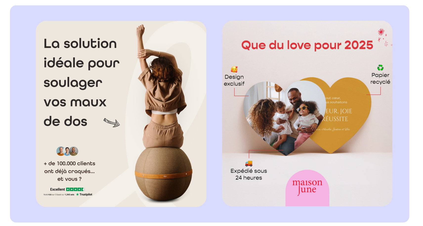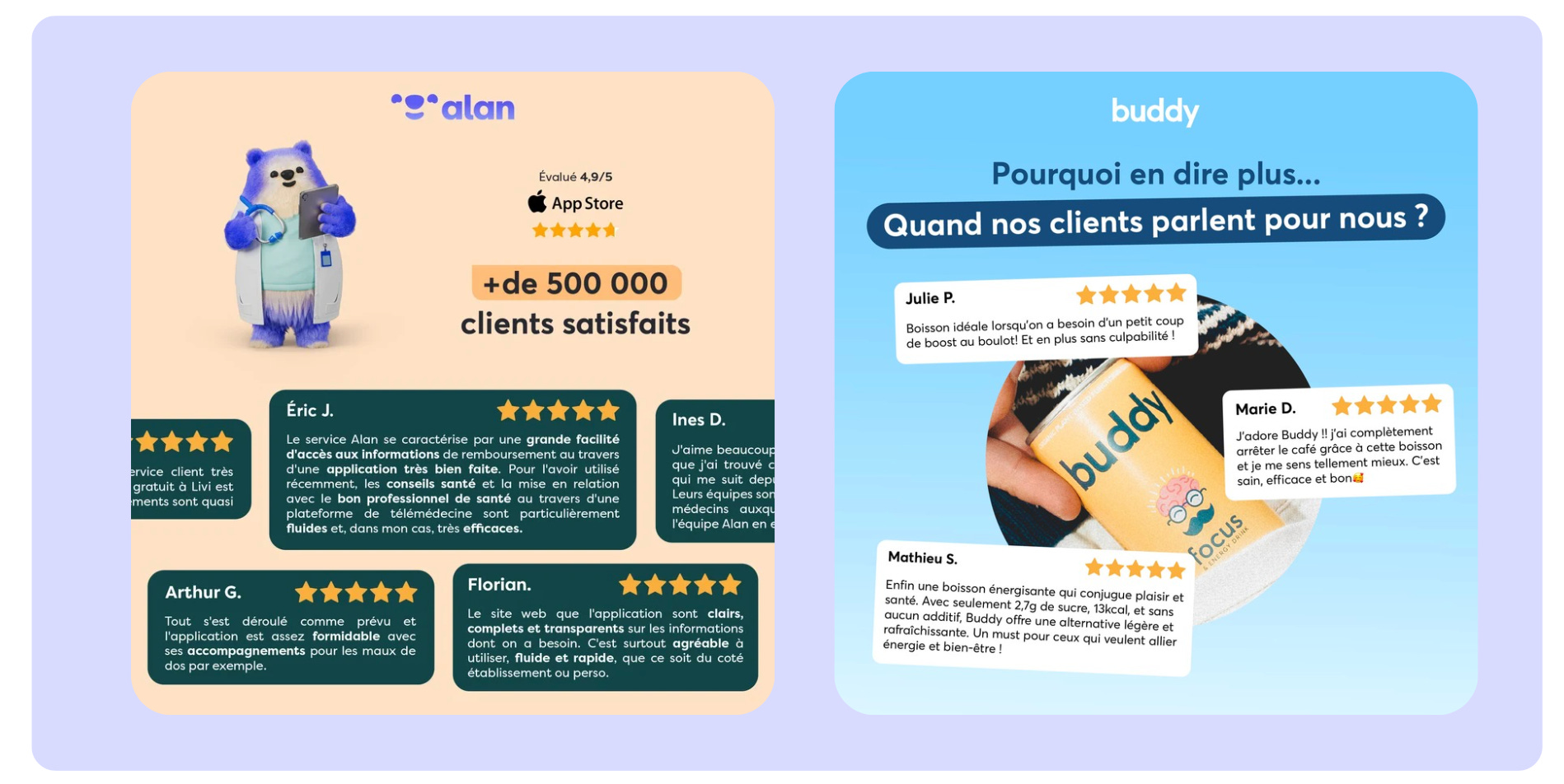 Vous avez compris ici que le meilleur exemple créatif que je peux vous donner est une créa “social proof” où on met à la fois des avis en avant et un nombre important de clients convaincus !