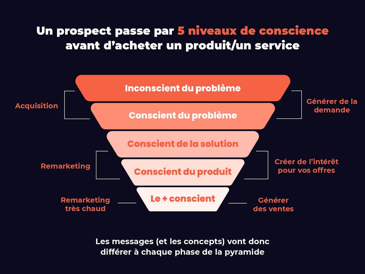 Inspirée des travaux d’Eugene Schwartz, cette pyramide classe vos prospects en 5 niveaux selon leur état de conscience vis-à-vis de votre produit.