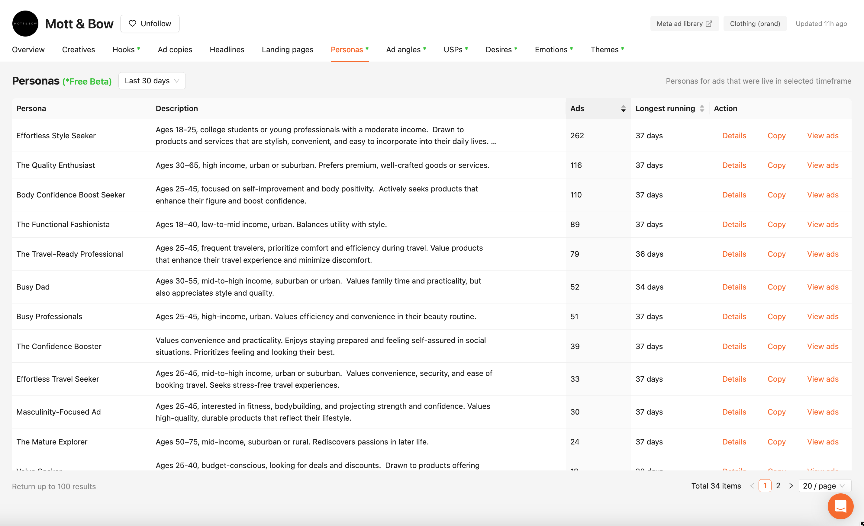 Je me rends simplement dans la section “Personas” de la marque et Atria me donne les top personas classés par le nombre de publicités total et nombre de publicités qui ont roulé le plus longtemps.