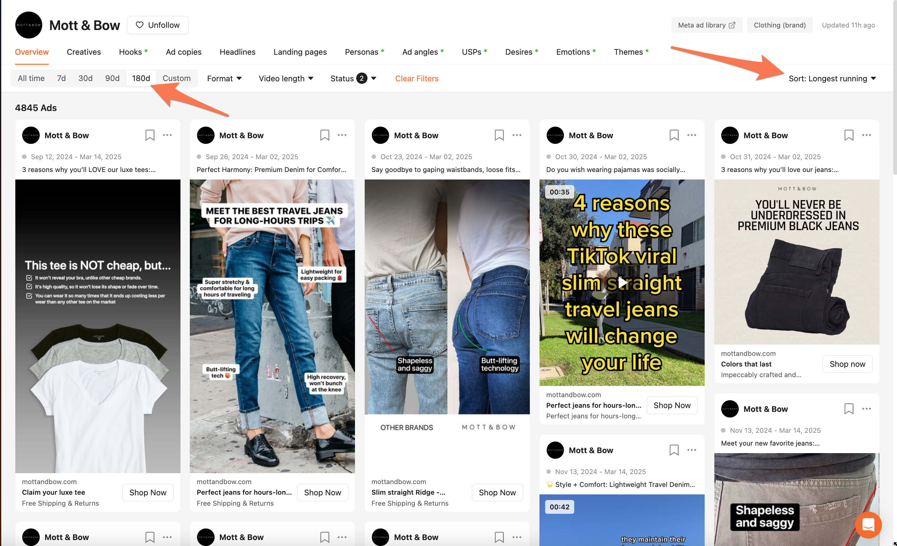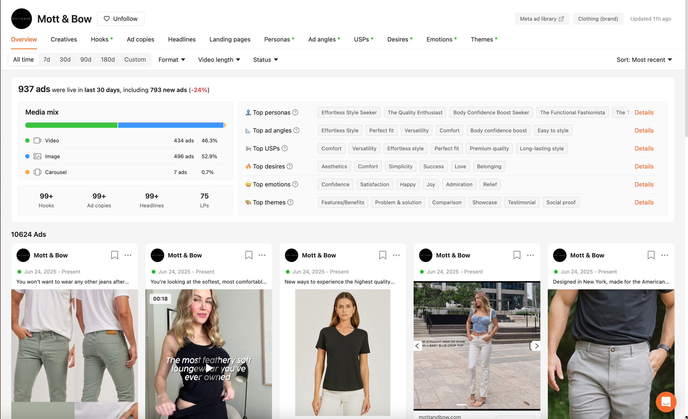Comme on peut le voir, c’est pas moins de 937 publicités qui ont tourné les 30 derniers jours pour cette marque, incluant 793 nouvelles publicités. Cela ne chôme pas chez Mott & Bow !