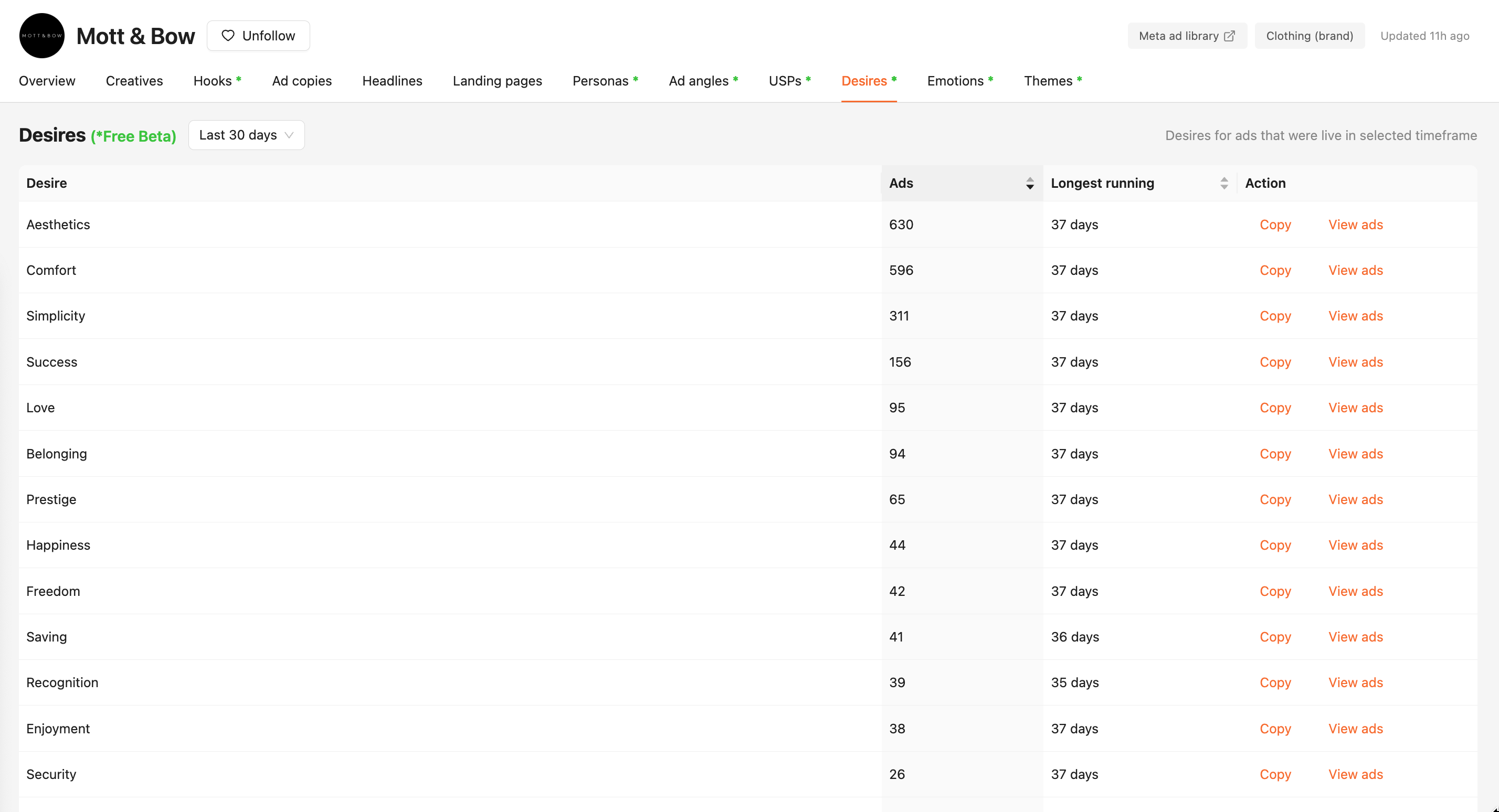 À votre droite, vous avez également un aperçu des top personas, angles, USPs, désirs, …