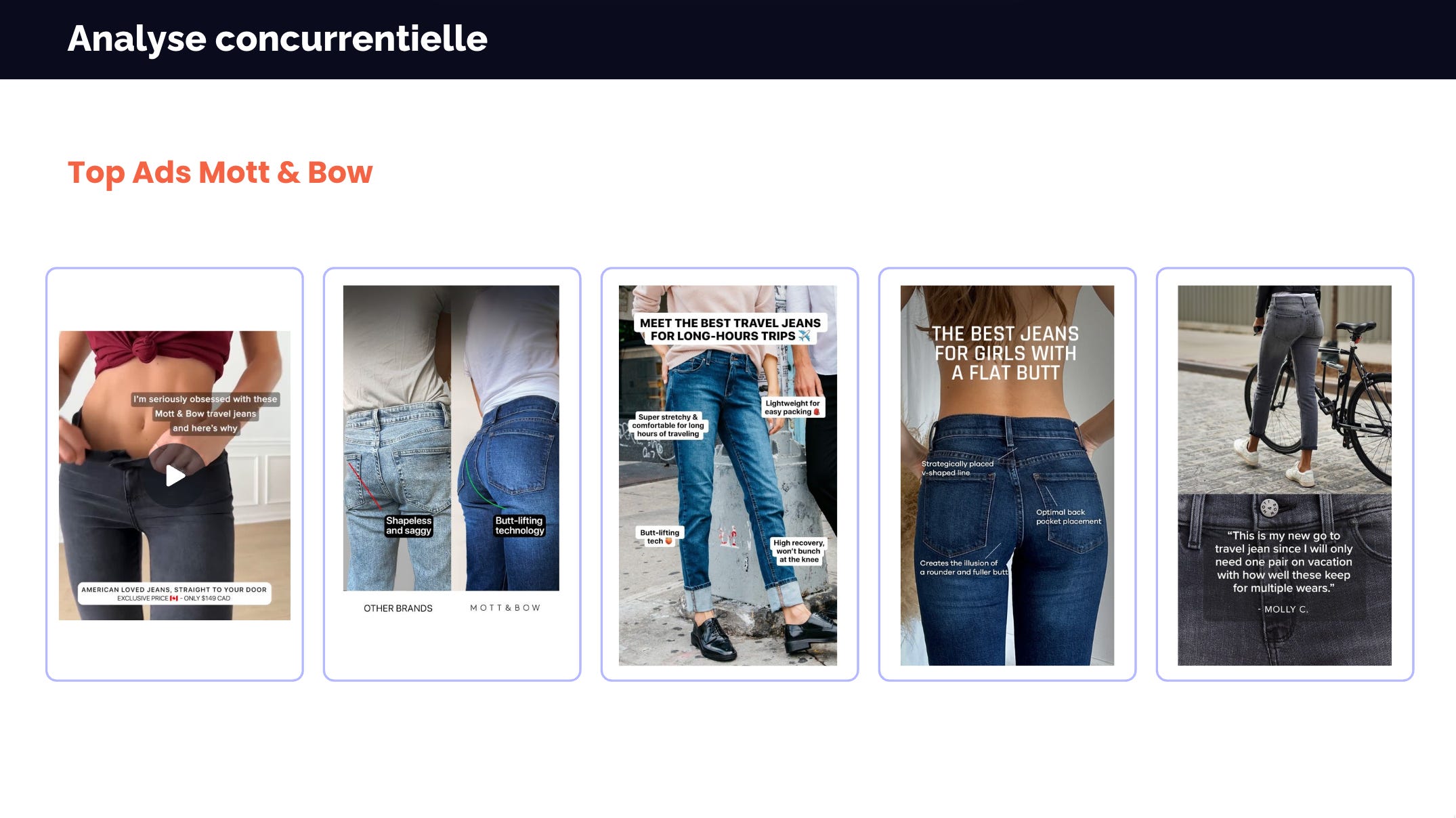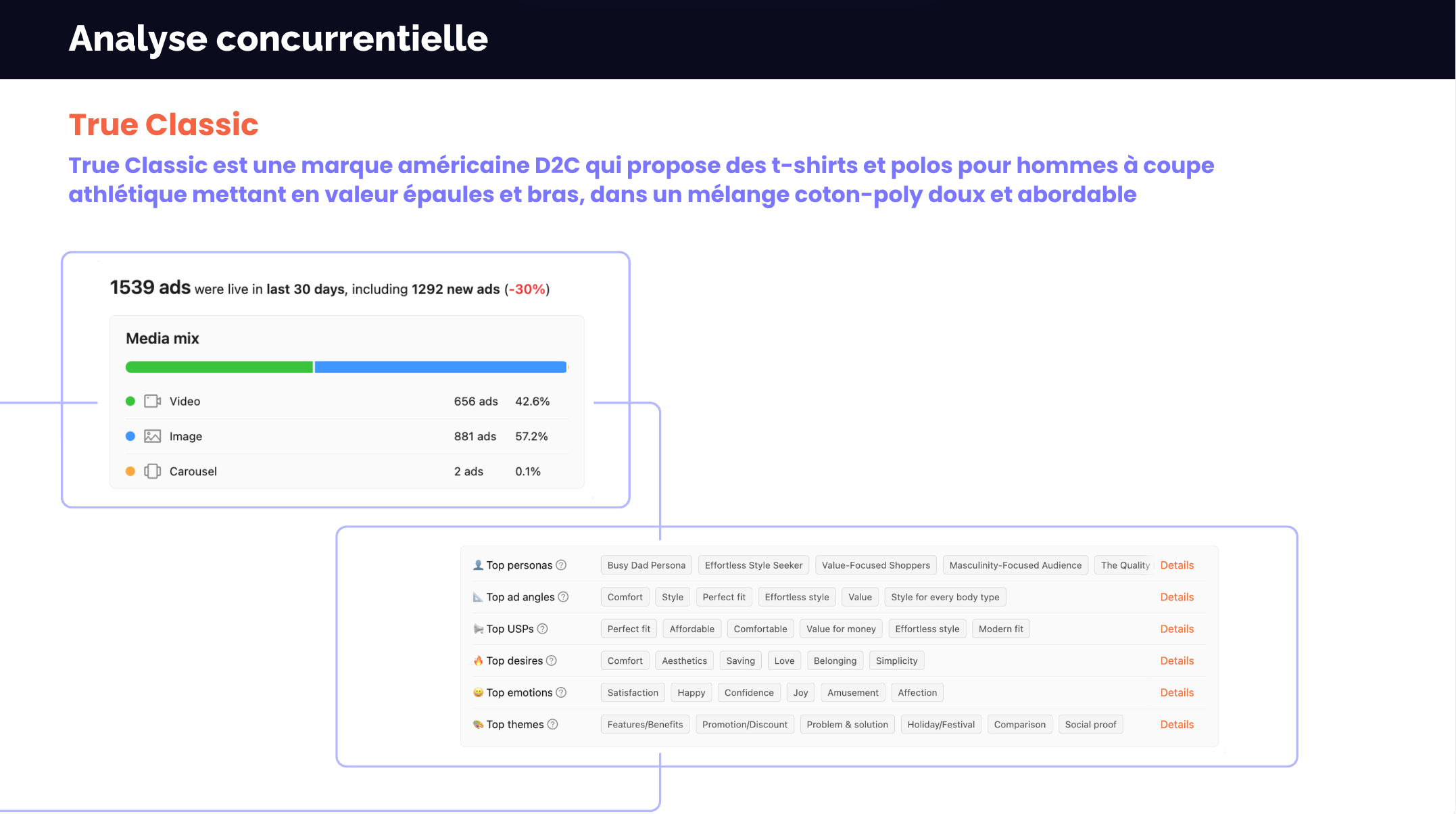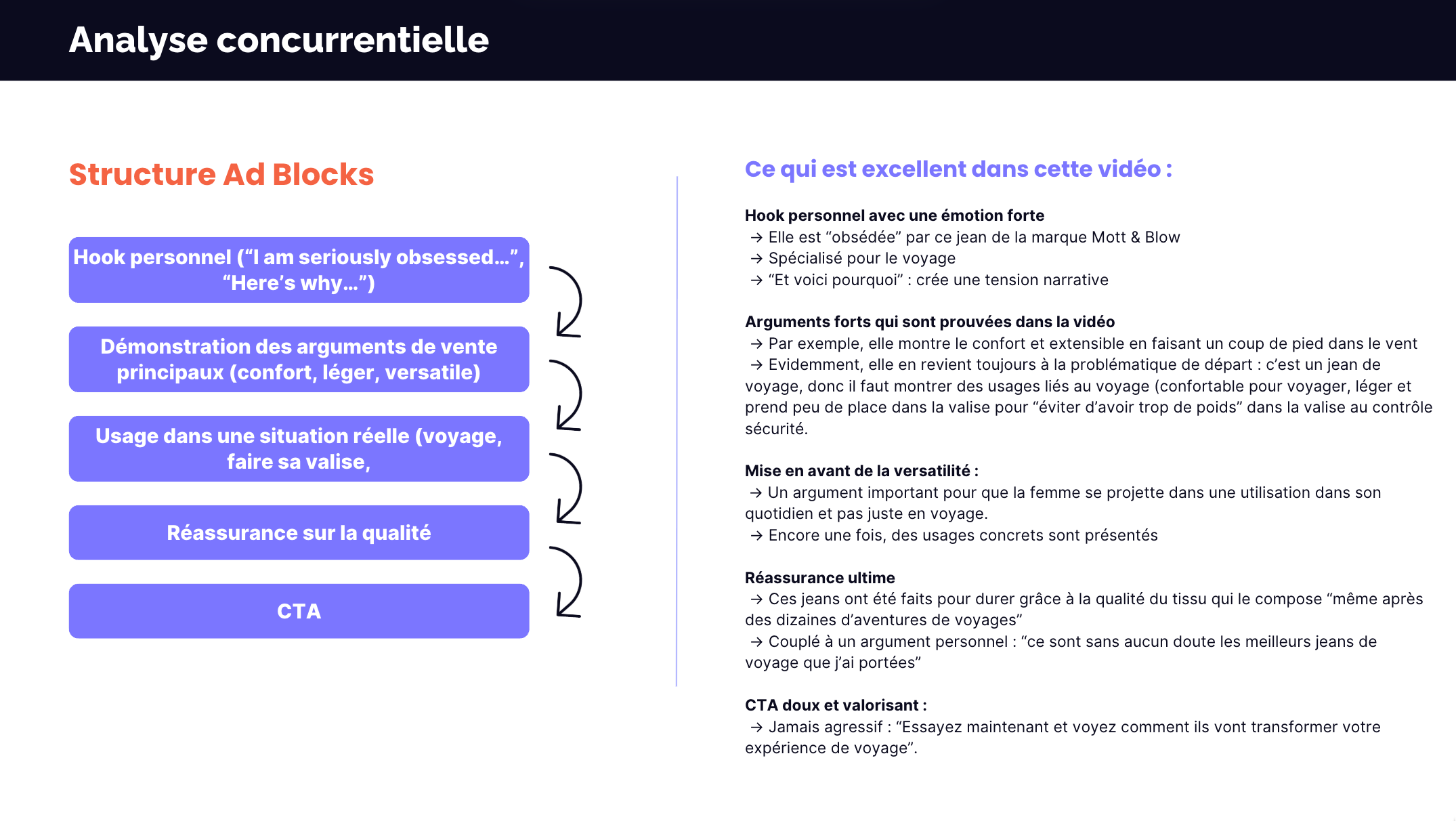 Dans le cas de cette marque, on observe que les angles principaux sont reliés au style, le confort, la versatilité, … et c’est effectivement ce que j’ai observé en analysant les publicités.
