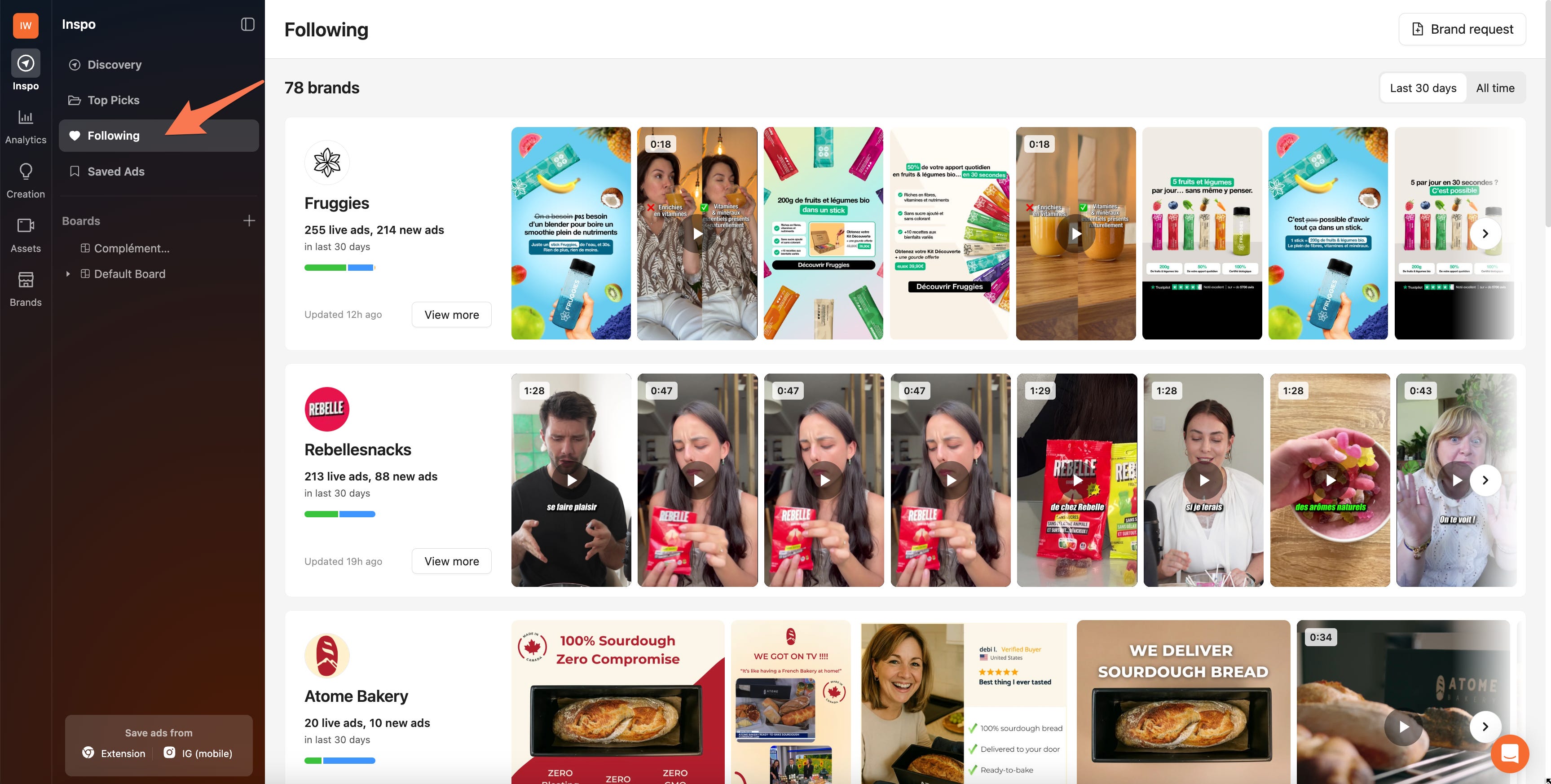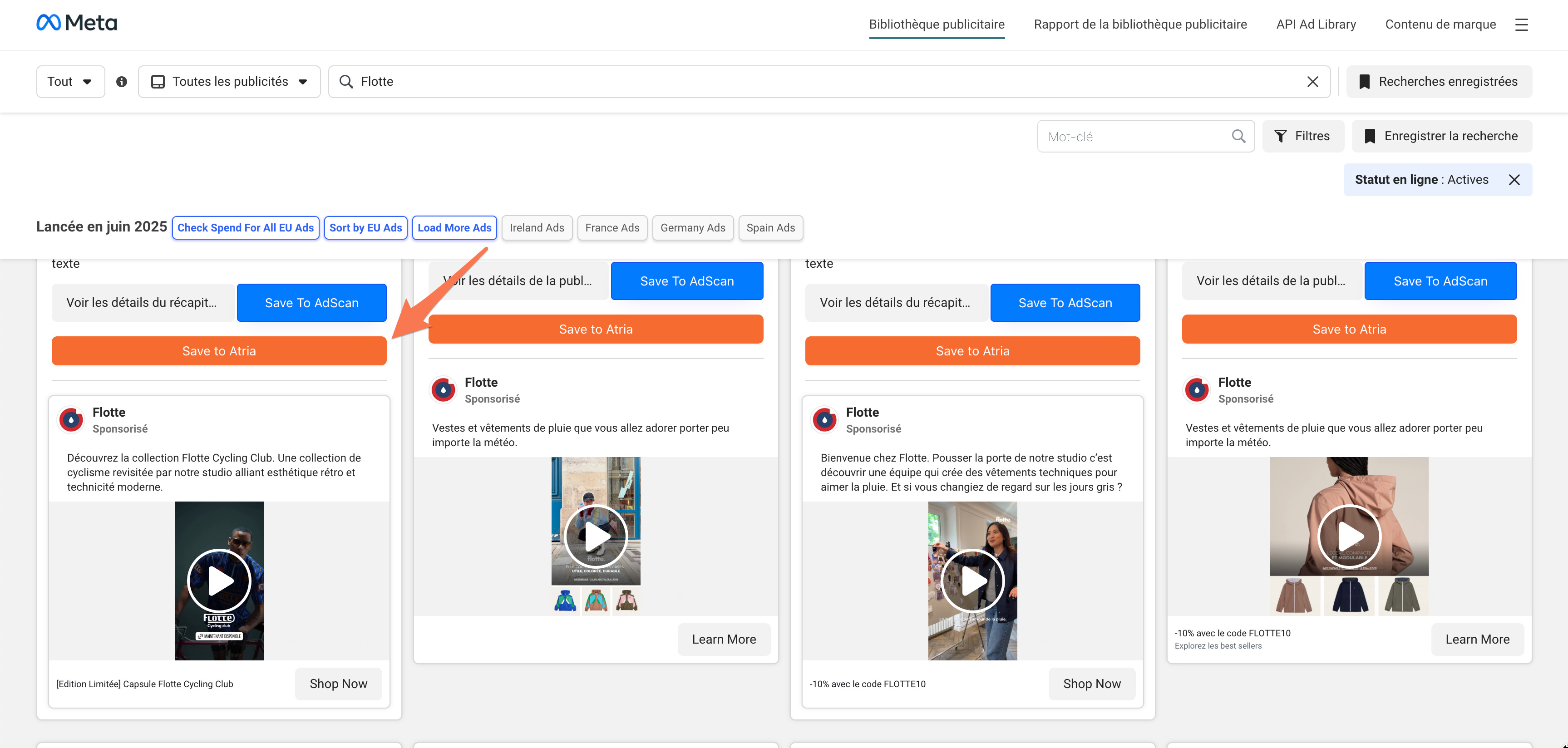 Si vous ne la trouvez pas, Atria a une extension Chrome et vous pouvez enregistrer n’importe quelle pub dans la Bibliothèque Meta, puis retrouver la pub dans Atria et ensuite suivre la marque :