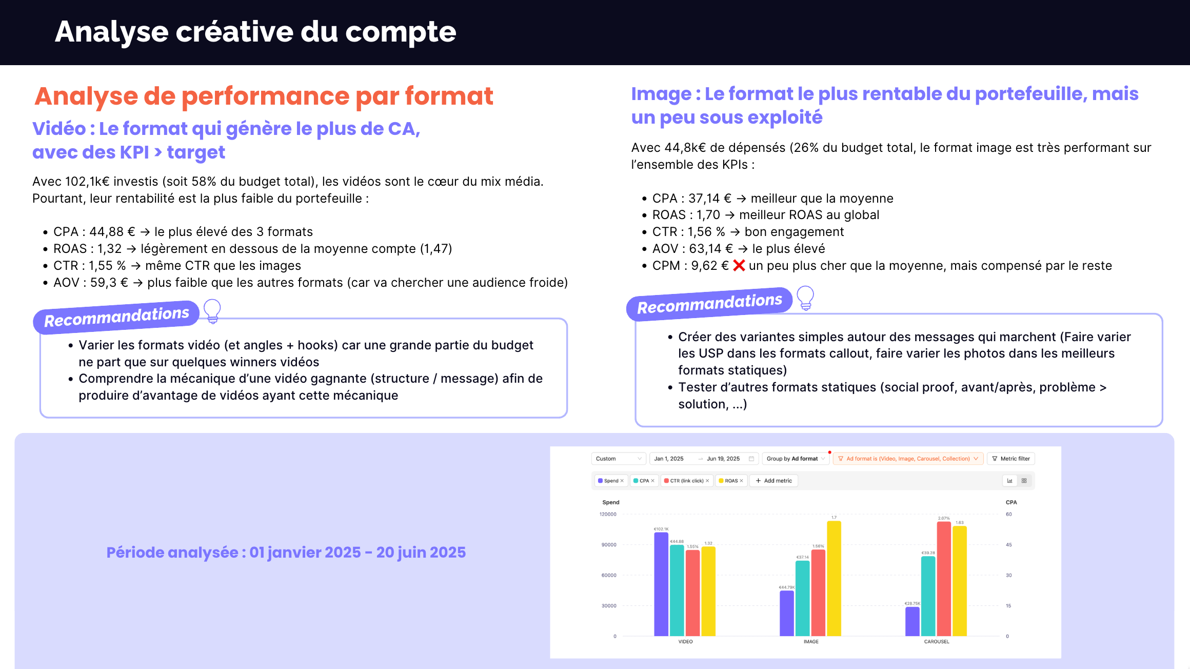 Recommandation : Analyser vos créas sur une période suffisamment large pour tirer des conclusions. Par défaut, nous faisons cette analyse sur 6 mois, mais si le compte a des dépenses importantes, on peut aussi faire cette analyse sur 3 mois !