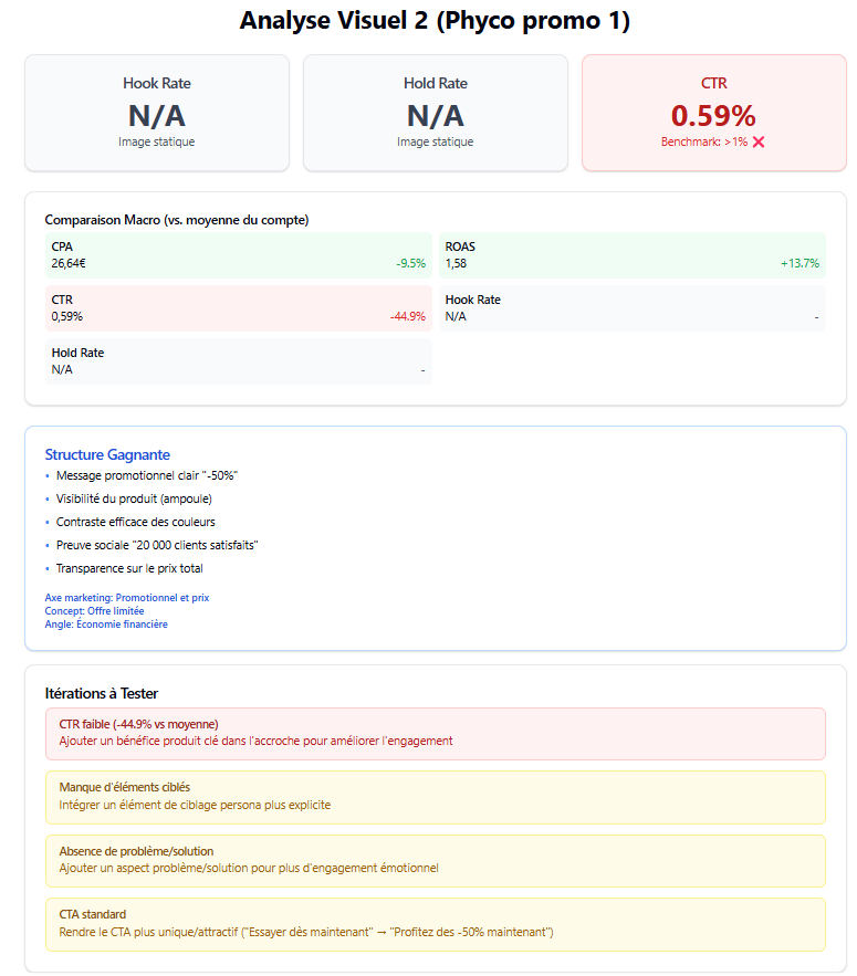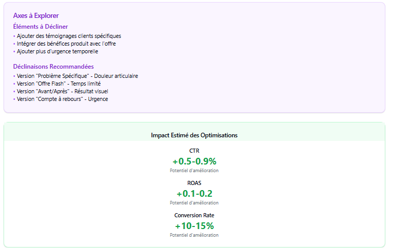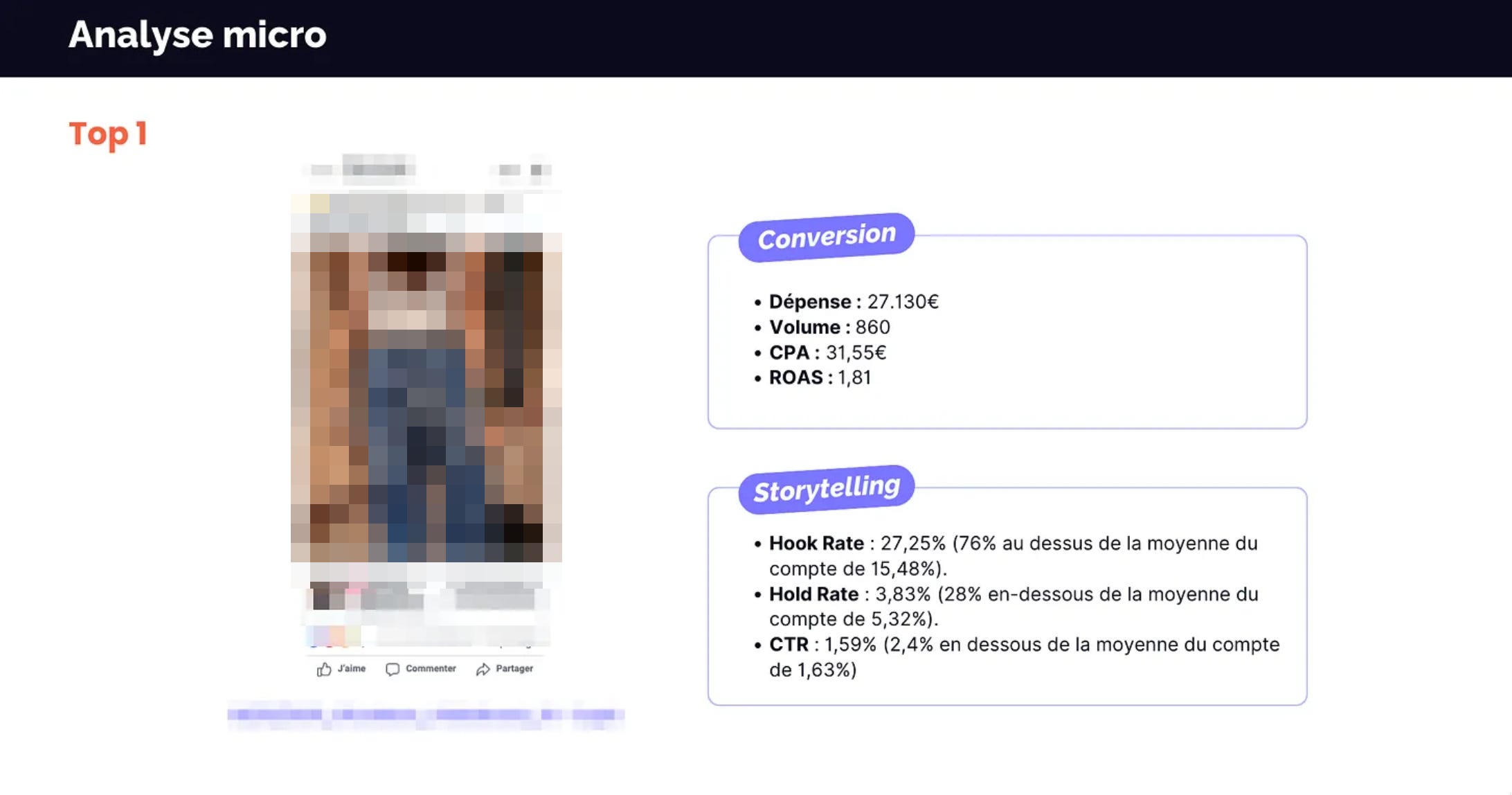 Ces indicateurs aident à déterminer ce qui rend vos publicités efficaces, comme le hook, la structure et le CTA.