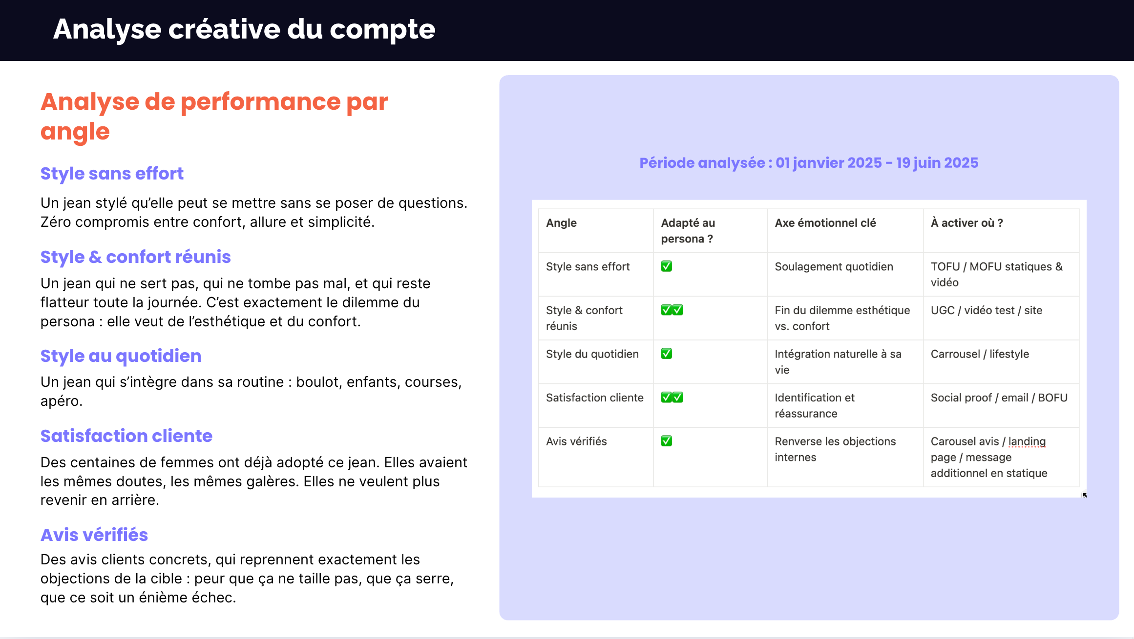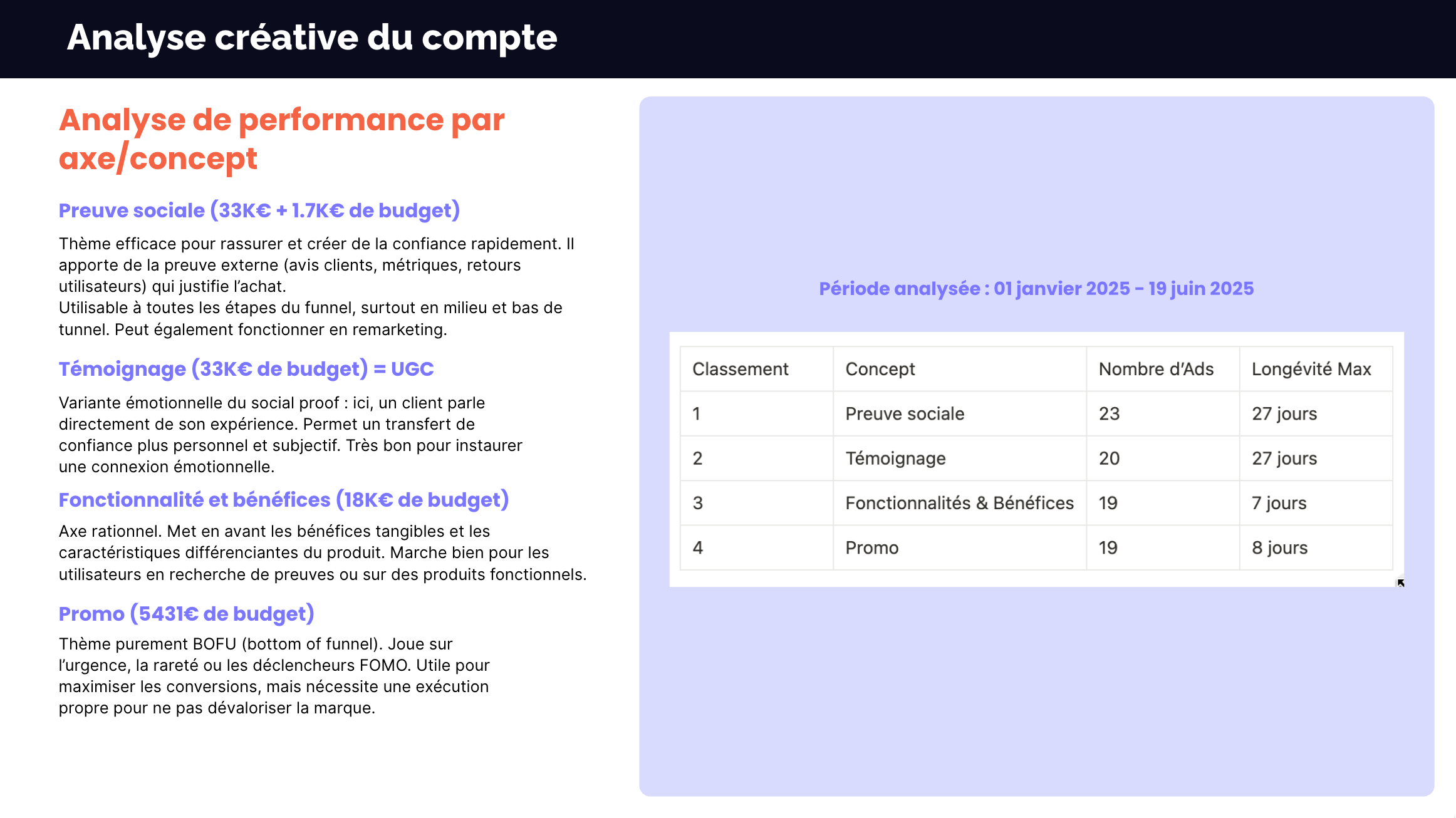 En segmentant chaque création de cette manière, nous pouvons valider des hypothèses précises, tester des variantes ciblées et tendre vers ce que nous appelons une “créa idéale”.