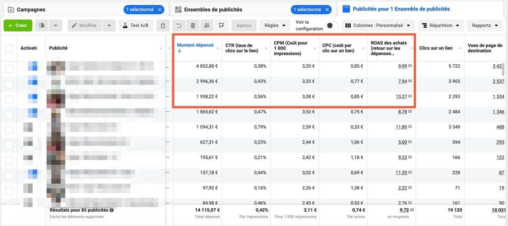 Chez DHS Digital, nous avons une stratégie bien précise : nous analysons les publicités qui ont généré au moins 10 achats au CPA ou ROAS cible.