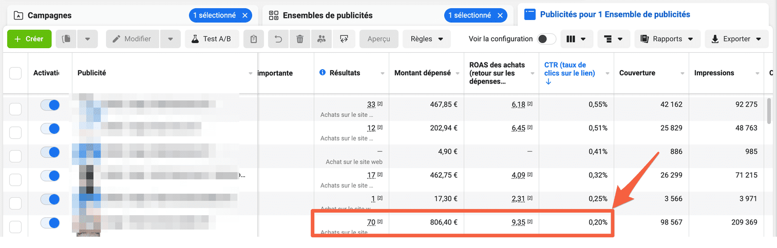 A l’inverse, une créa peut avoir un taux de clic bien plus élevé que d’autres et donc générer beaucoup de trafic, mais peu de ventes. Encore une fois parce que ce trafic est moins qualifié.