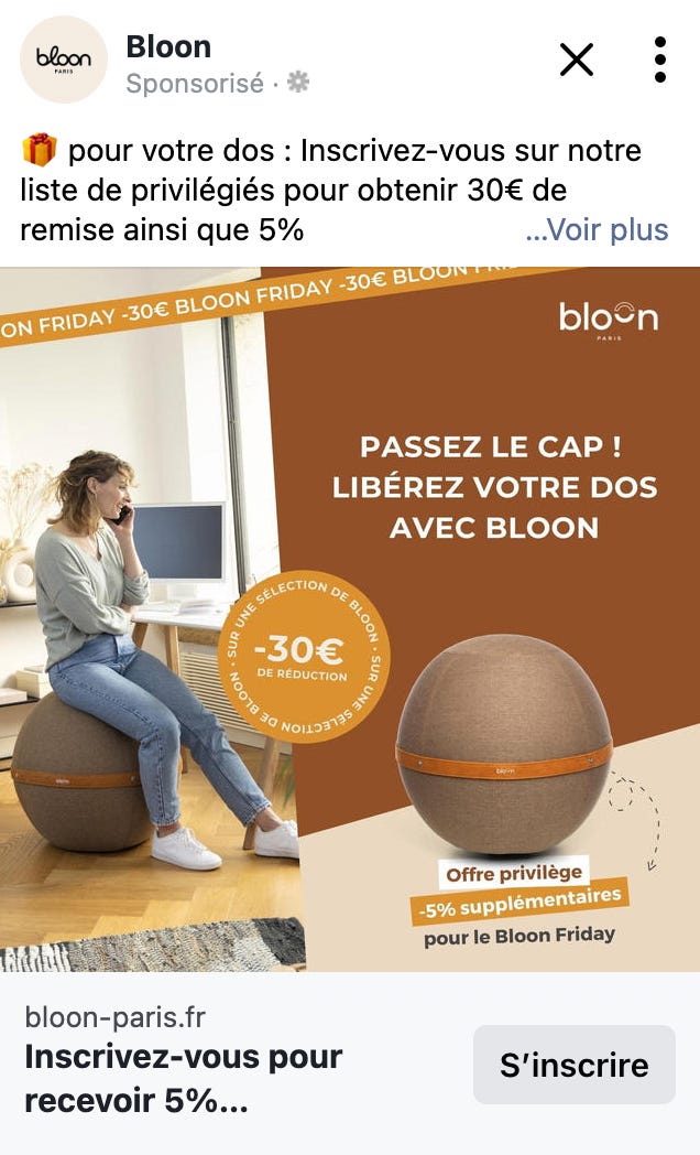 Il s’agit d’une campagne de récolte d’emails (objectif : prospects dans Meta) pour laquelle on va proposer une réduction inédite exclusivement réservée aux personnes qui s’inscrivent sur cette liste. Cela nous fait donc un 2e bassin d’audience sur lequel s’appuyer pour nos offres.