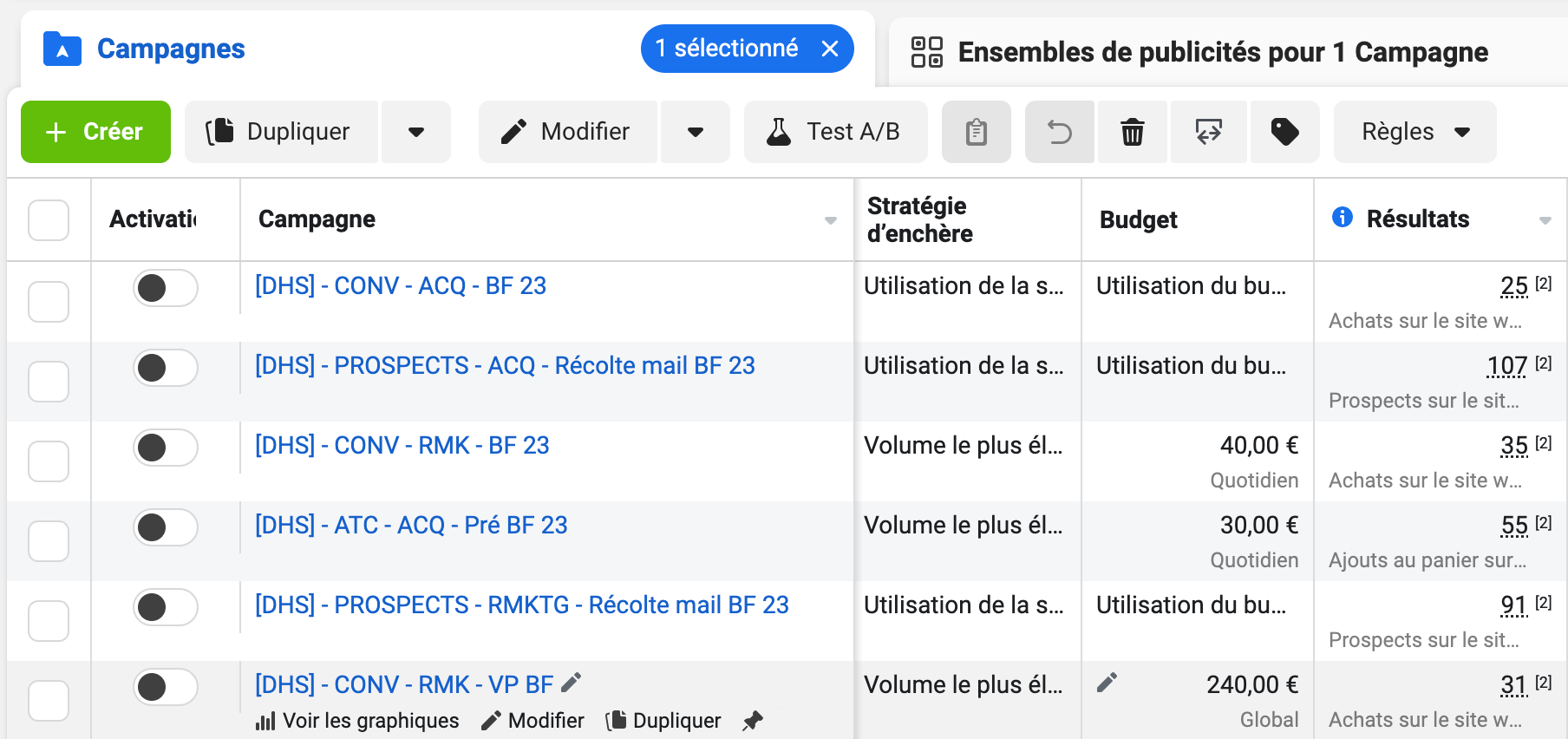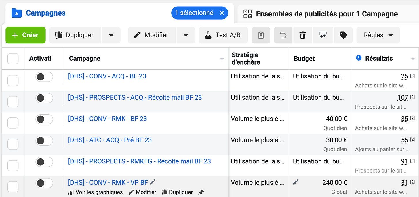 Pour le Black Friday, on choisit généralement de créer des campagnes dédiées avec un budget dédié, en plus de nos campagnes fil rouge (avec un très faible budget).