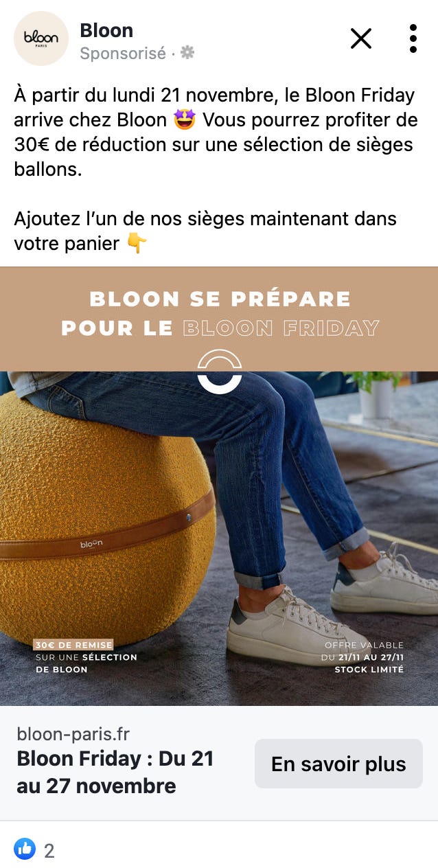On communique sur un message engageant de ce type : “ajoutez l’un de nos sièges à votre panier” et on renvoie sur une page catalogue produit pour inciter le public à préparer sa liste de shopping pour le BF, pour ensuite venir les recibler lors du lancement des promos.